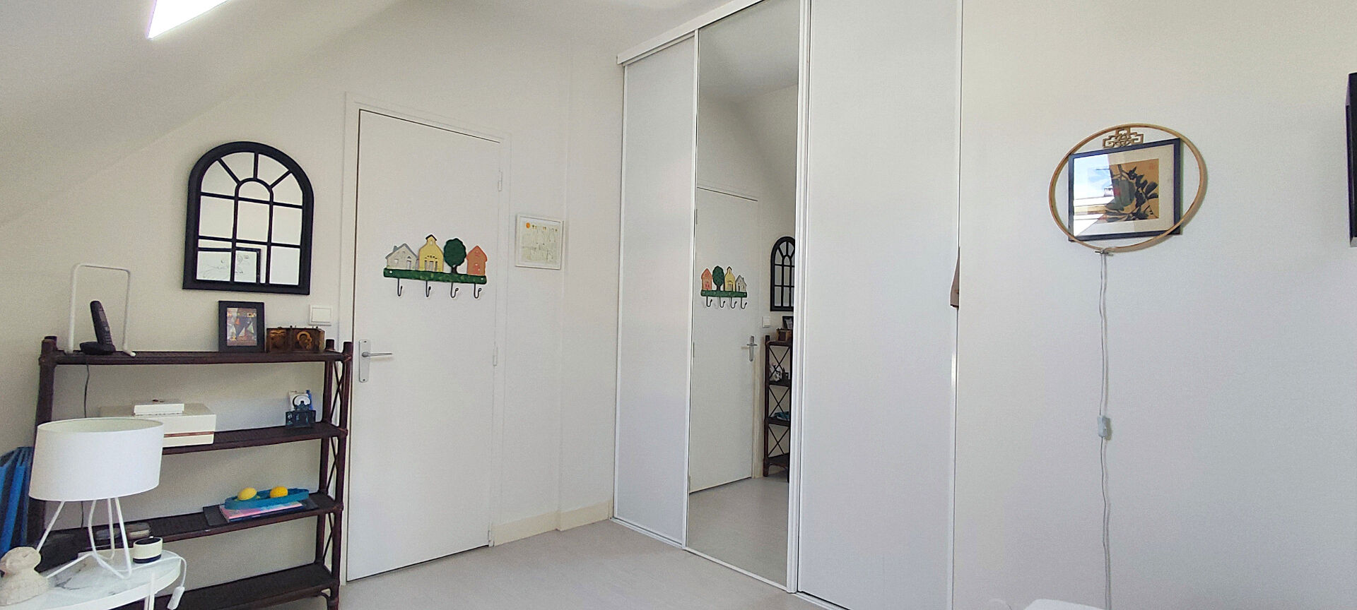 À l'étage, un pallier dessert deux chambres équipées de grands placards, une salle de bain avec WC et baignoire d'angle, un grand dressing et une terrasse (possibilité d'aménager l'étage de manière différente).