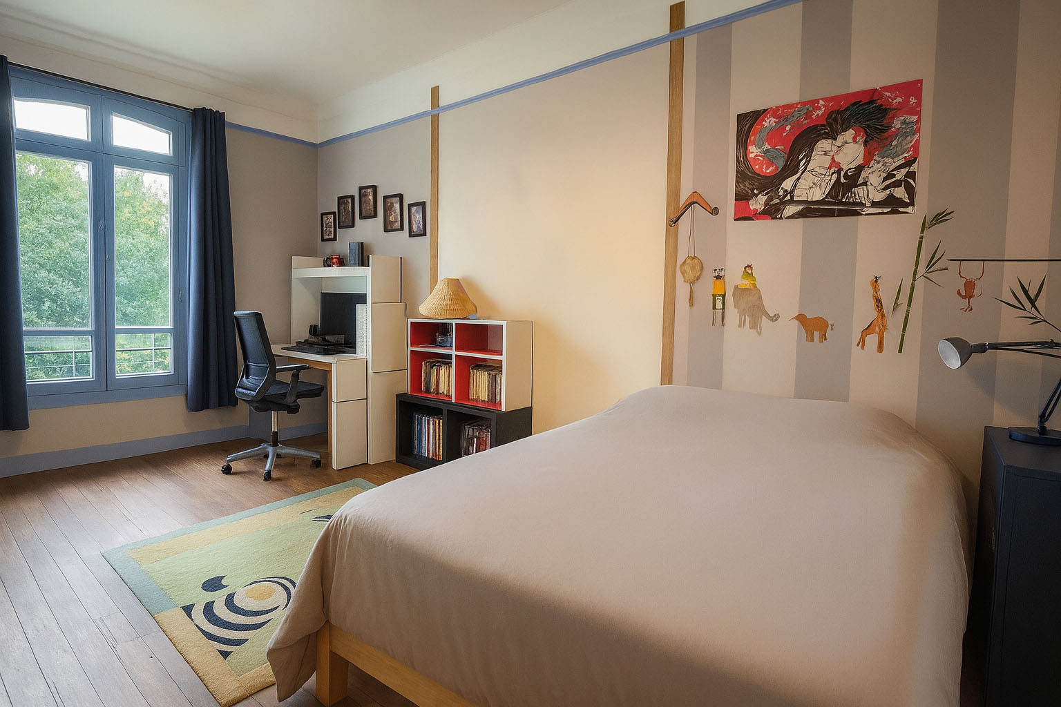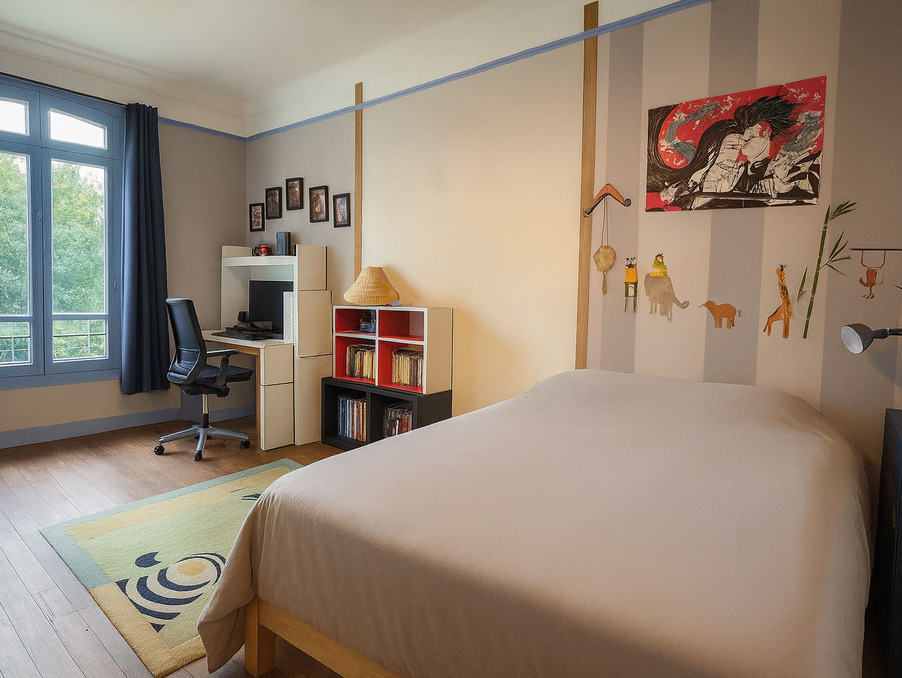 Les étages abritent six chambres, dont une suite parentale avec salle d'eau, ainsi qu'un bureau offrant une vue apaisante sur la Marne.