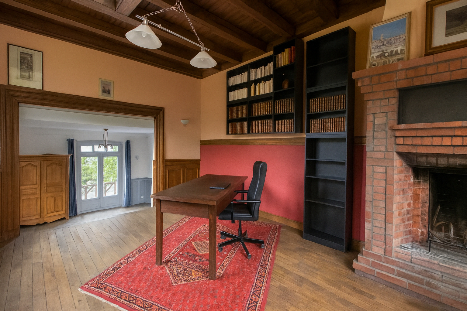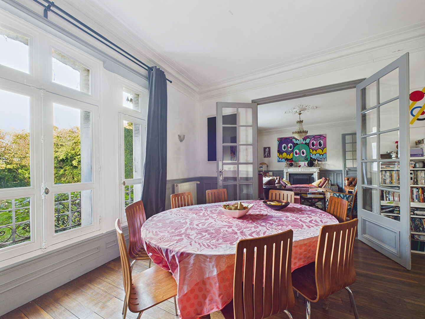 Le salon, orné d'une cheminée en marbre et de parquets anciens, invite à la détente, tandis que la salle à manger s'ouvre sur le jardin et la nature environnante.