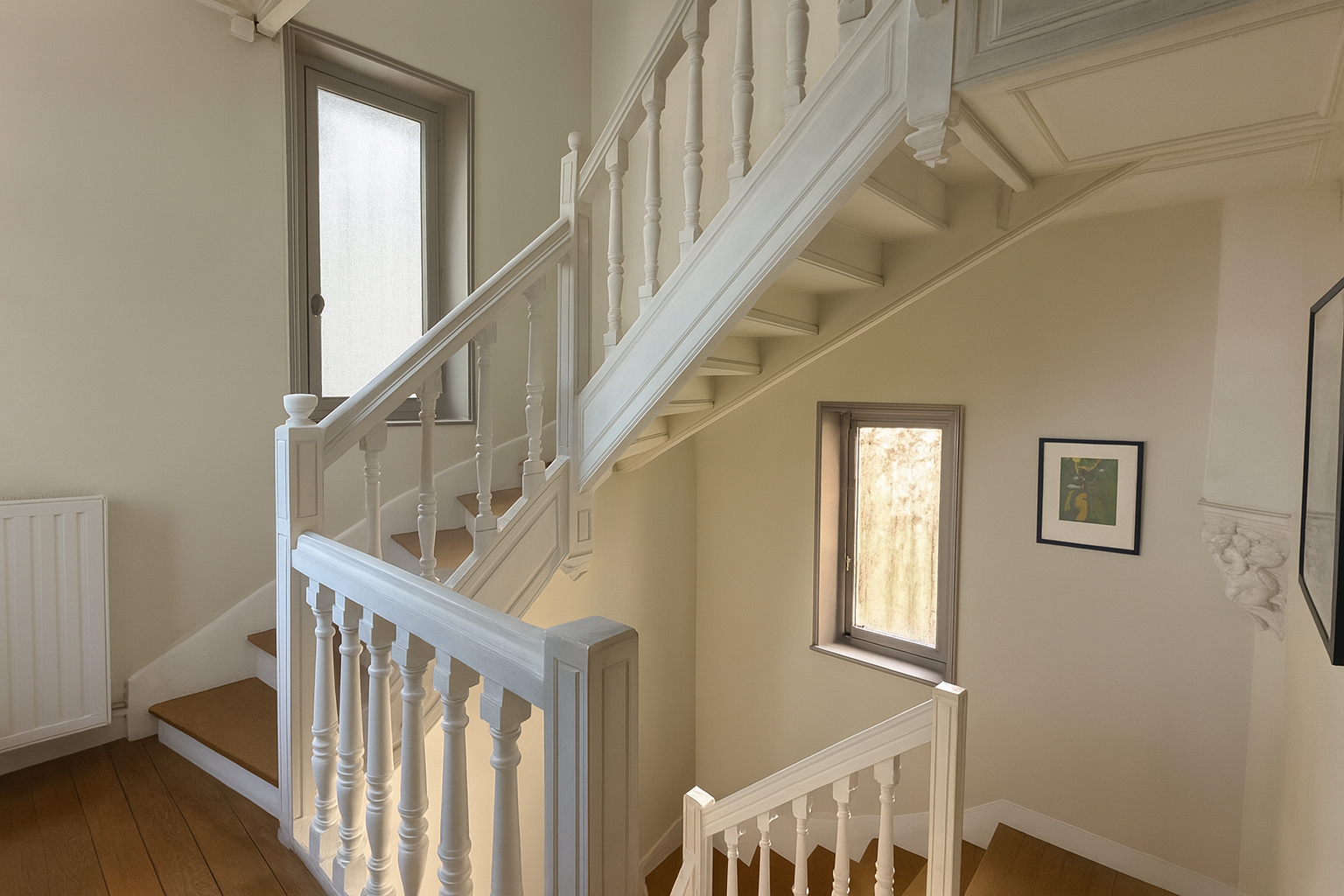 Dès l'entrée, le ton est donné : le majestueux escalier en bois patiné, véritable pièce d'architecture, distribue harmonieusement les niveaux de vie.