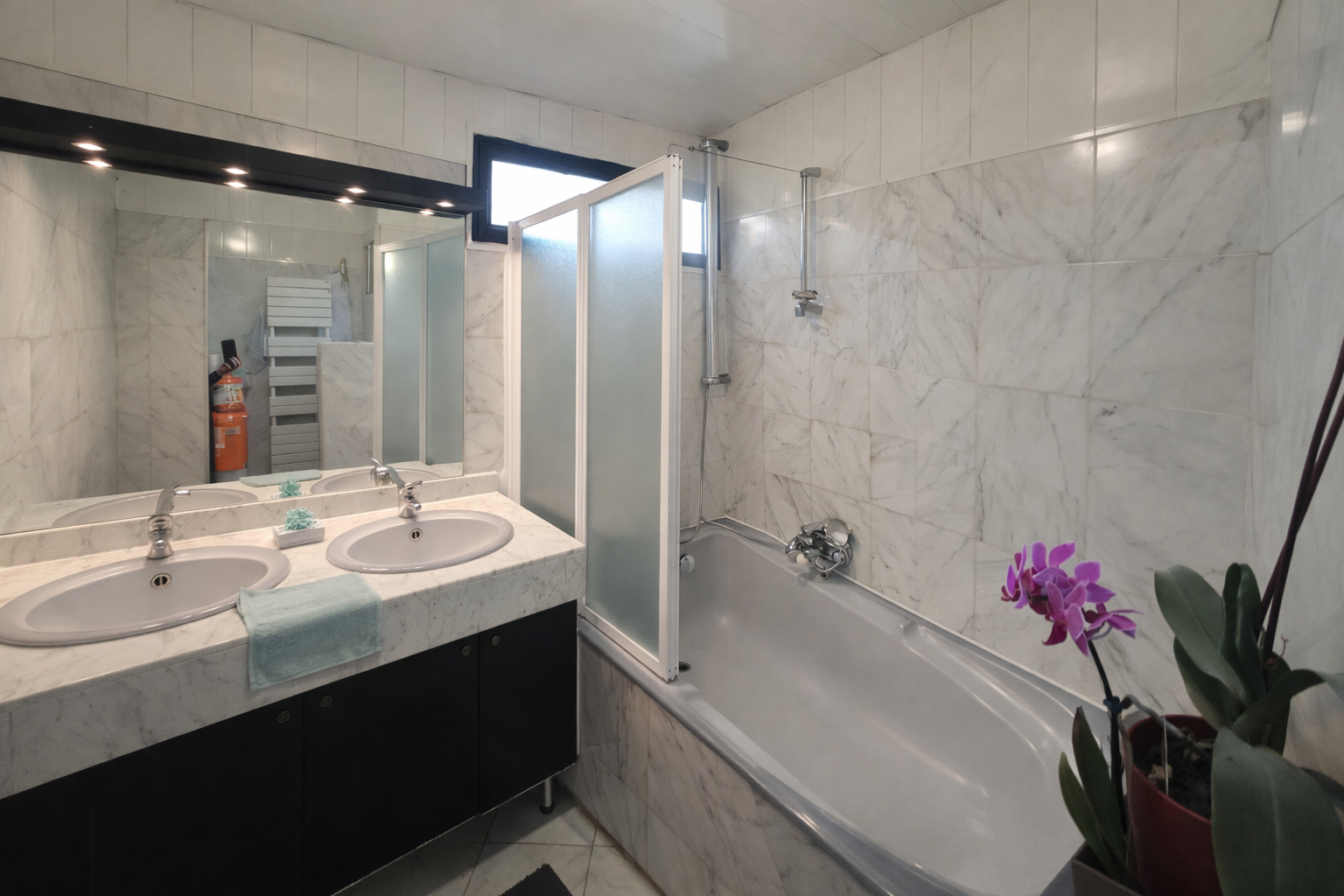 - À l'étage, un palier dessert deux chambres dont une avec terrasse donnant sur le jardin, ainsi qu'une salle de bain moderne avec double vasques et WC.
