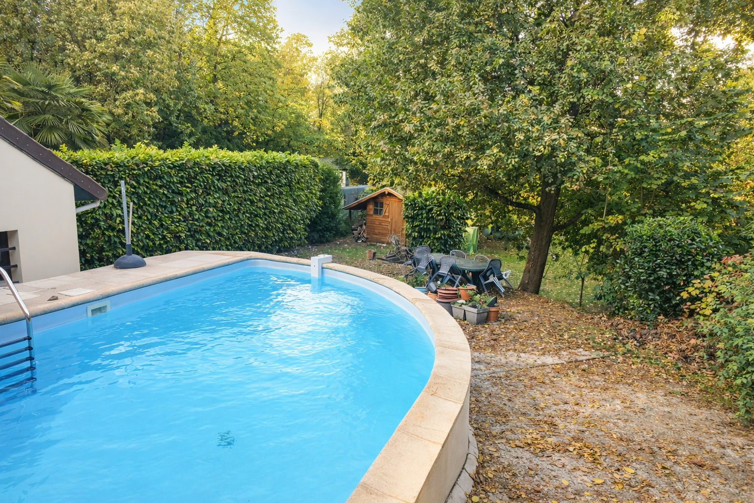 Pour les extérieurs, à l'arrière de la maison, un grand jardin arboré exposé sud ouest est complété par une piscine avec un grand local technique permettant de ranger du matériel.